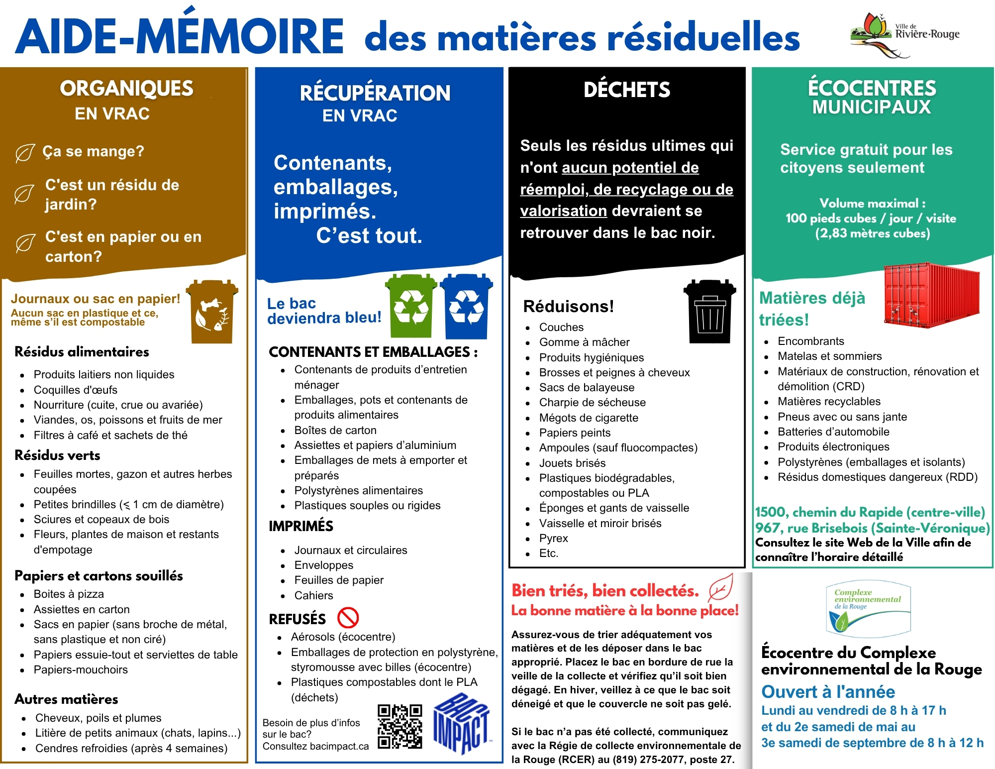 À Rivière-Rouge, les collectes des matières résiduelles sont effectuées par secteur. Pour connaître la date de la prochaine collecte à être effectuée dans votre secteur, veuillez consulter le calendrier correspondant :